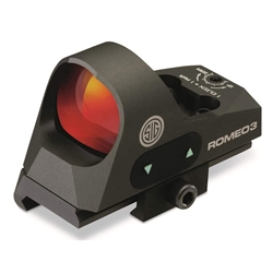 The Romeo3 Miniature Reflex Sight is an ideal sighting solution for MSR/AR rifles, shotguns, carbines, submachine guns, and full-size handguns. This sight features a high transmittance red notch reflector for excellent brightness, light transmittance, and zero distortion. A 3 MOA Red Dot with multiple intensity settings ensures rapid target engagement under a full range of lighting conditions. Featuring Sig’s MOTAC (Motion Activated Illumination System) that powers up when it senses motion and powers down when it does not, the Romeo3 provides optimum operational safety and enhanced battery life. The readily available CR2032 battery is side-loading, allowing for quick battery replacement without having to remove the sight from the firearm. This sight is housed in extremely strong and lightweight aircraft grade CNC Aluminum which ensures a lifetime of reliable service, and gives dependable waterproof and fogproof performance.